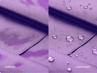 Nachher: Water Seal bildet eine wirksame Barriereschicht, die dazu beiträgt, dass sich Wassertropfen bilden, abperlen und von der Stoffoberfläche abrollen, wodurch das Eindringen von Wasser in Ihre Kleidung verhindert wird und Sie trocken bleiben!