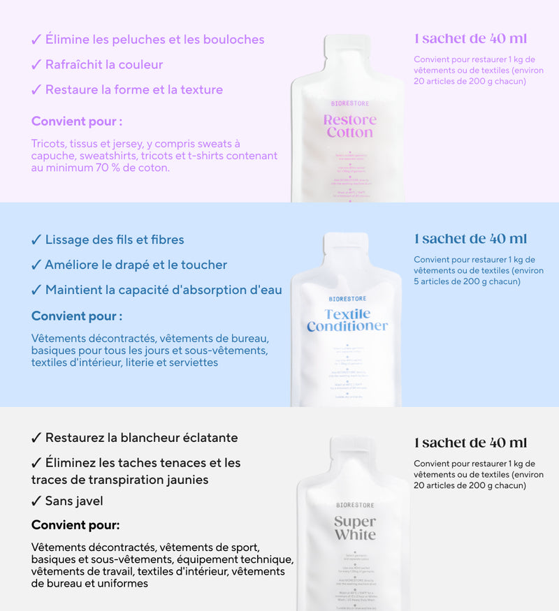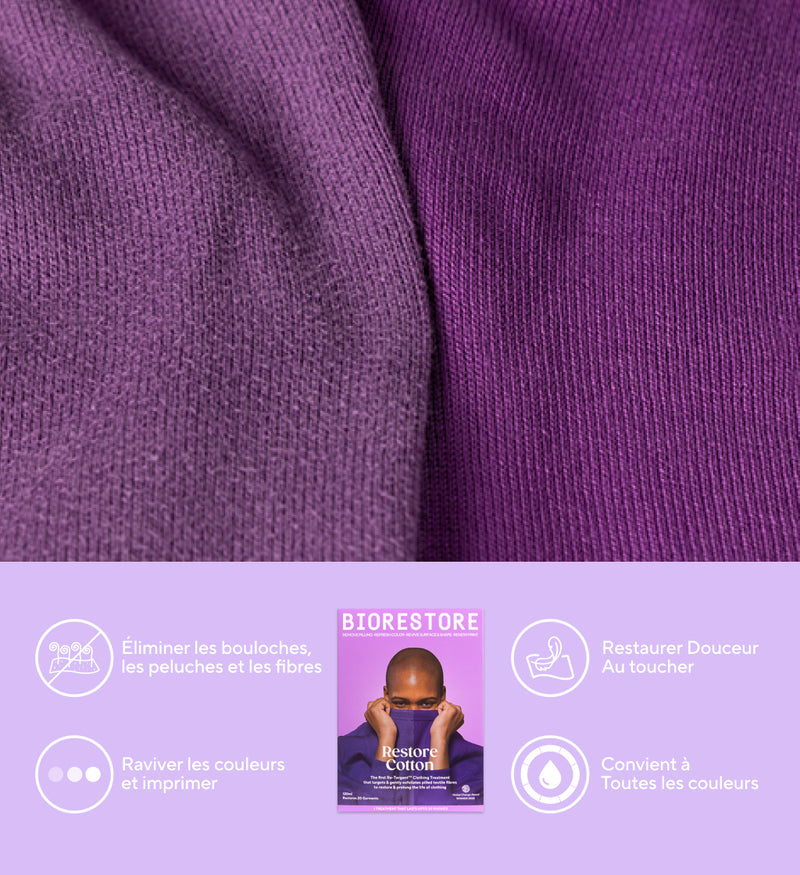 Restore Cotton: Revives faded colors, removes pilling, and restores softness without any dyes or mess. Ideal for fabrics with 70%+ cotton.