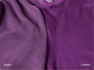 Après: Les couleurs sont rafraîchies et éclatantes, les bouloches et les peluches sont éliminées, ce qui renouvelle la surface du vêtement et lui donne un toucher et un aspect lisses.