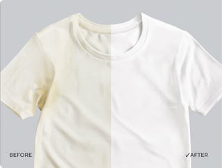 After: Sweat stain yellowing, grime and stains are removed, resulting in brightened & vibrant white clothing for a renewd look & feel.